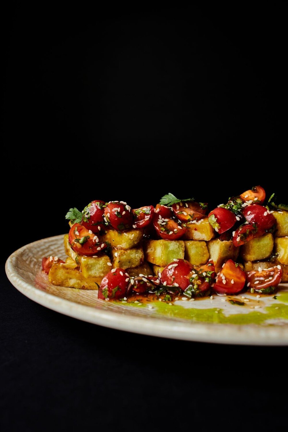 Спелые сочные помидоры черри на подиуме из хрустящих баклажанов в ароматном соусе Азия-Восток с красным луком и кинзой