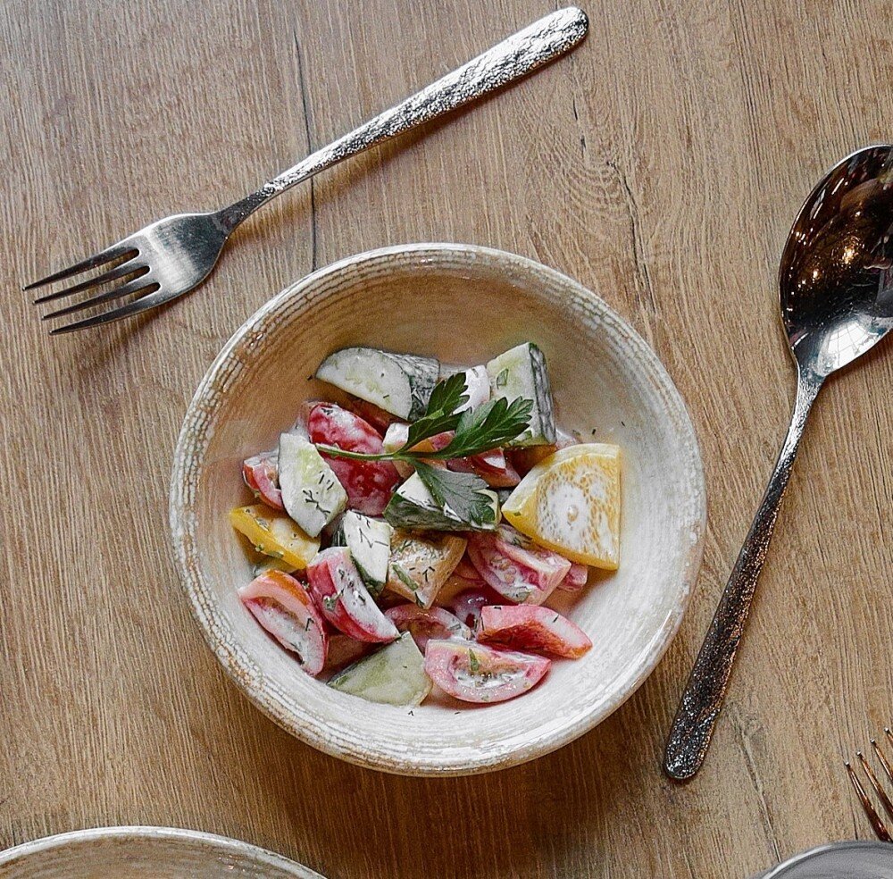 Свежие помидоры черри, огурцы. болгарский перец, сметана