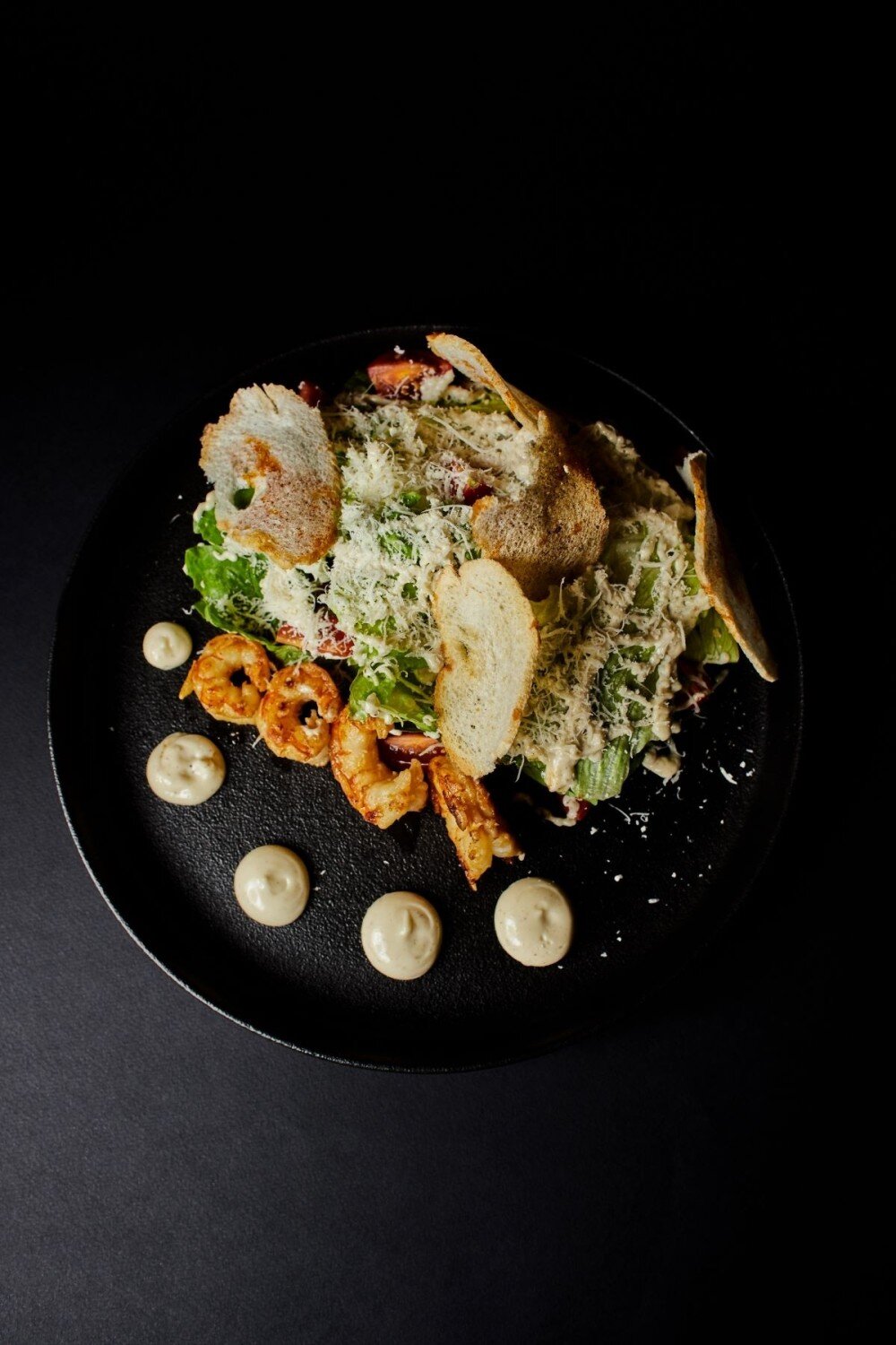 Свежие томаты черри, листья Айсберга и Романо, соус Цезарь, гренки, Пармезан, жареные креветки